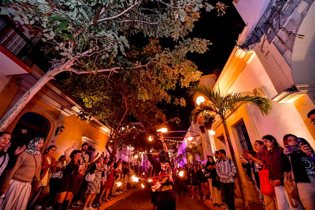 Las calles del antiguo puerto vibraron al ritmo de la batucada en la fiesta al aire libre organizada por el Instituto de Cultura de Mazatlán, mientras algunos jóvenes hacían malabares e iluminaban la noche dibujando círculos de fuego y las alegres notas de la banda sinaloense generaban un ambiente de fiesta e invitaban a bailar.