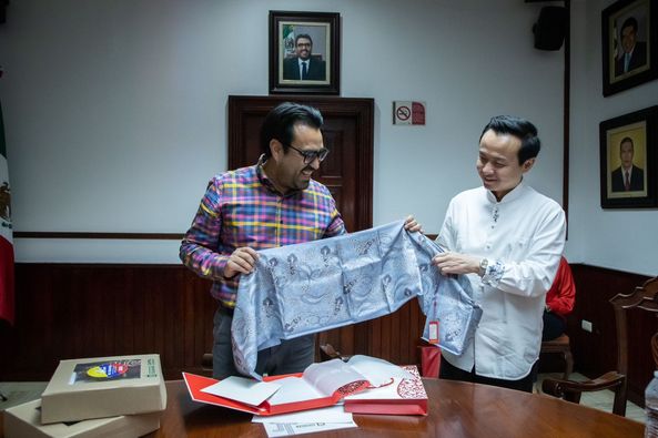Juan de Dios Gámez obsequió a Zhang Run una gorra y una casaca del equipo de béisbol Tomateros de Culiacán, así como libros que hablan sobre la historia del municipio, una canasta de postres diversos y a su vez, el funcionario le obsequió unas mascadas típicas de China, tanto para él como para su esposa.