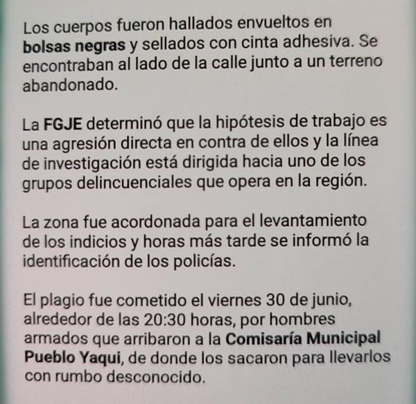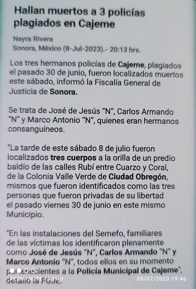 HALLAN MUERTOS A TRES POLICÍAS DE CAJEME «LEVANTADOS» HACE UNA SEMANA. *Los tres eran hermanos. (Tomado de Reforma)