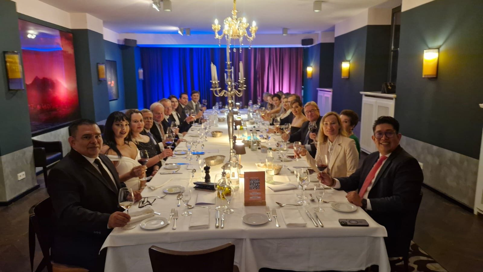 La Notaria Pública mazatleca, Rosa Alicia León, (vestido blanco) asiste a una reunión internacional con sede en Berlín, donde la delegación del Colegio del Notariado Mexicano se reúne, en el marco de una cena, con el Colegio de Notarios de Alemania.
