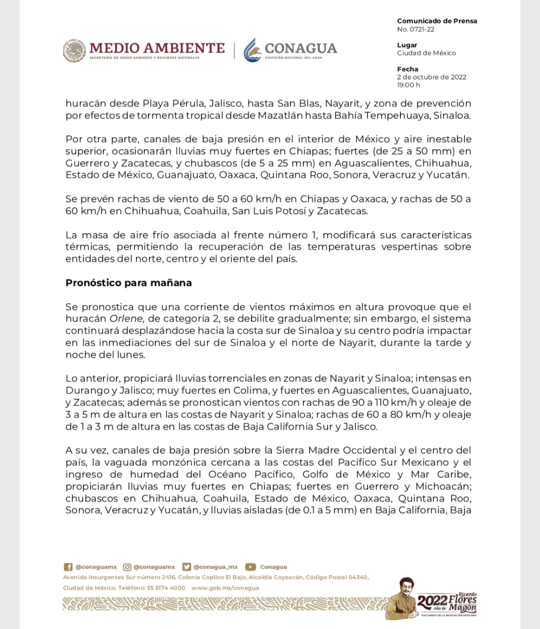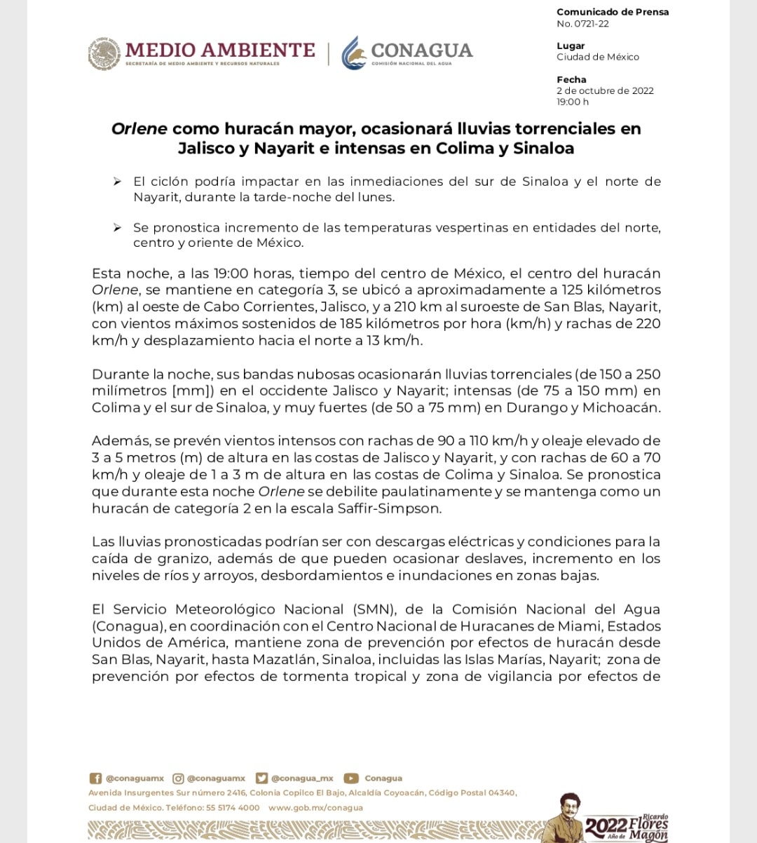 El Servicio Meteorológico Nacional informóna las 7:00 PM de hoy, que esta noche el huracán «Orlene» toca tierra en Nayarit como categoría tres, pero que en el transcurso de su desplazamiento bajará a categoría 2.