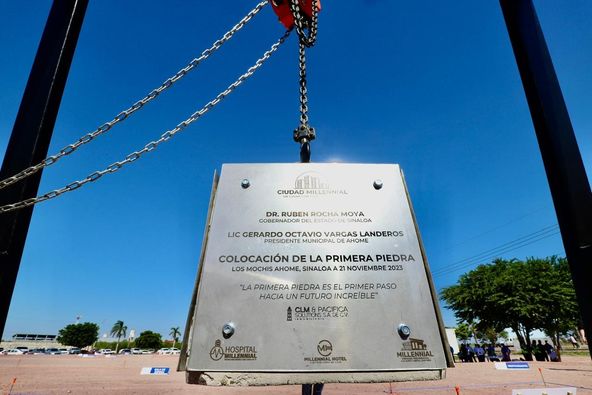 Los Mochis, Ahome, Sinaloa, a 21 de noviembre de 2023.- Acompañado por inversionistas locales, el gobernador Rubén Rocha Moya colocó la primera piedra de un moderno complejo denominado Ciudad Millennial, en Los Mochis, donde se invertirán 750 millones de pesos y que comprenderá una oferta de servicios diversos, empezando por un hospital de alta especialidad, con ocho quirófanos y uno de ellos con tecnología robótica, el primero en todo el noroeste en su tipo, una torre de consultorios médicos, así como un hotel Business Class, una plaza comercial y una zona residencial.