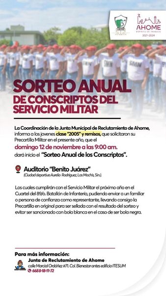 Los Mochis, Ahome, Sinaloa, a 1 de Noviembre del 2023.- Los jóvenes clase “2005” y remisos que solicitaron su precartilla durante el presente año, son convocados al Sorteo anual de conscriptos del Servicio Militar, que tendrá lugar el próximo domingo 12 de noviembre, en el Auditorio Benito Juárez.