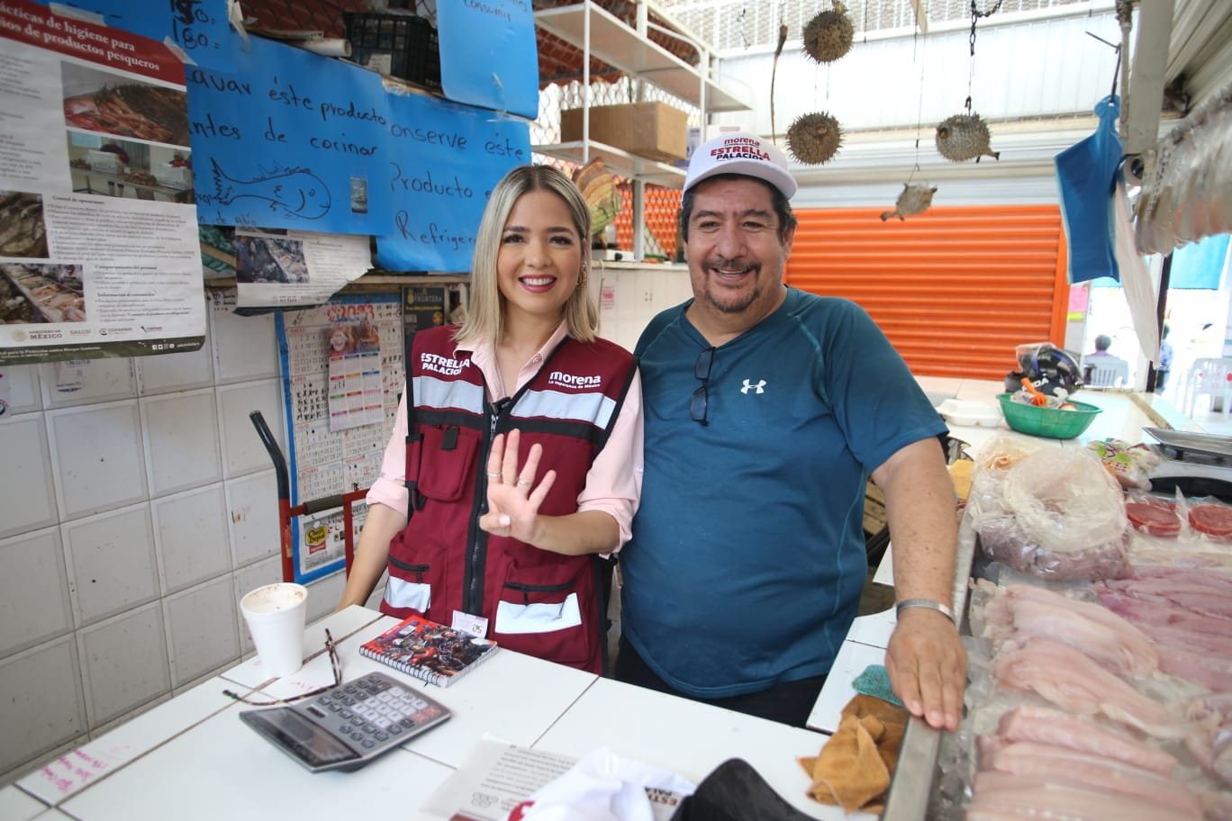 Mazatlán, Sinaloa.- Estrella Palacios, candidata de Morena a la alcaldía de Mazatlán se metió al mercado “Juan Carrasco”, recorrió los pasillos, saludó a los comerciantes, se tomó fotos con clientes y locatarios y hasta bailó, para sorpresa de todos.